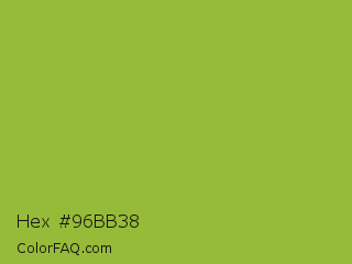 Hex #96bb38 Color is a normal lime color and the nearest color is Android Green #a4c639. Hex code #96bb38 and RGB value is rgb(150,187,56). In RGB color space, this color is composed of 59% red, 73% green, 22% blue, In CMYK color space, this color is composed of 20% cyan, 0% magenta, 70% yellow , 27% black , In HSL color space, this color has a hue angle of 77° , 54% saturation and 48% lightness.