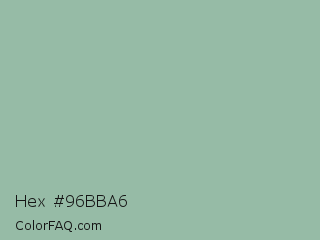 Hex #96bba6 Color is a light green color and the nearest color is Summer Green #96bbab. Hex code #96bba6 and RGB value is rgb(150,187,166). In RGB color space, this color is composed of 59% red, 73% green, 65% blue, In CMYK color space, this color is composed of 20% cyan, 0% magenta, 11% yellow , 27% black , In HSL color space, this color has a hue angle of 146° , 21% saturation and 66% lightness.