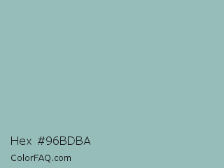 Hex #96bdba Color is a light cyan color and the nearest color is Shadow Green #9ac2b8. Hex code #96bdba and RGB value is rgb(150,189,186). In RGB color space, this color is composed of 59% red, 74% green, 73% blue, In CMYK color space, this color is composed of 21% cyan, 0% magenta, 2% yellow , 26% black , In HSL color space, this color has a hue angle of 175° , 23% saturation and 66% lightness.