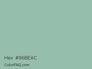 Hex #96beac Color is a light green color and the nearest color is Summer Green #96bbab. Hex code #96beac and RGB value is rgb(150,190,172). In RGB color space, this color is composed of 59% red, 75% green, 67% blue, In CMYK color space, this color is composed of 21% cyan, 0% magenta, 9% yellow , 25% black , In HSL color space, this color has a hue angle of 153° , 24% saturation and 67% lightness.