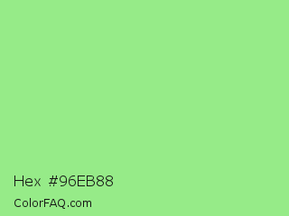 Hex #96eb88 Color is a light green color and the nearest color is Light Green #90ee90. Hex code #96eb88 and RGB value is rgb(150,235,136). In RGB color space, this color is composed of 59% red, 92% green, 53% blue, In CMYK color space, this color is composed of 36% cyan, 0% magenta, 42% yellow , 8% black , In HSL color space, this color has a hue angle of 112° , 71% saturation and 73% lightness.