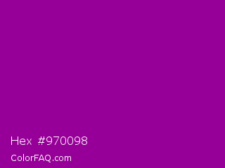 Hex #970098 Color is a dark magenta color and the nearest color is Violet Eggplant #991199. Hex code #970098 and RGB value is rgb(151,0,152). In RGB color space, this color is composed of 59% red, 0% green, 60% blue, In CMYK color space, this color is composed of 1% cyan, 100% magenta, 0% yellow , 40% black , In HSL color space, this color has a hue angle of 300° , 100% saturation and 30% lightness.