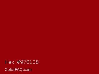 Hex #970108 Color is a dark red color and the nearest color is Sangria #92000a. Hex code #970108 and RGB value is rgb(151,1,8). In RGB color space, this color is composed of 59% red, 0% green, 3% blue, In CMYK color space, this color is composed of 0% cyan, 99% magenta, 95% yellow , 41% black , In HSL color space, this color has a hue angle of 357° , 99% saturation and 30% lightness.