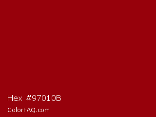 Hex #97010b Color is a dark red color and the nearest color is Sangria #92000a. Hex code #97010b and RGB value is rgb(151,1,11). In RGB color space, this color is composed of 59% red, 0% green, 4% blue, In CMYK color space, this color is composed of 0% cyan, 99% magenta, 93% yellow , 41% black , In HSL color space, this color has a hue angle of 356° , 99% saturation and 30% lightness.