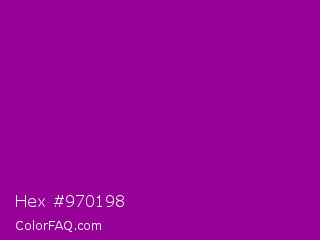 Hex #970198 Color is a dark magenta color and the nearest color is Violet Eggplant #991199. Hex code #970198 and RGB value is rgb(151,1,152). In RGB color space, this color is composed of 59% red, 0% green, 60% blue, In CMYK color space, this color is composed of 1% cyan, 99% magenta, 0% yellow , 40% black , In HSL color space, this color has a hue angle of 300° , 99% saturation and 30% lightness.