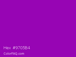 Hex #9705b4 Color is a normal purple color and the nearest color is Violet RYB #8601af. Hex code #9705b4 and RGB value is rgb(151,5,180). In RGB color space, this color is composed of 59% red, 2% green, 71% blue, In CMYK color space, this color is composed of 16% cyan, 97% magenta, 0% yellow , 29% black , In HSL color space, this color has a hue angle of 290° , 95% saturation and 36% lightness.