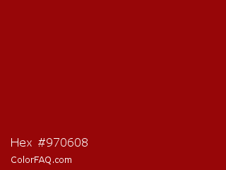 Hex #970608 Color is a normal red color and the nearest color is Sangria #92000a. Hex code #970608 and RGB value is rgb(151,6,8). In RGB color space, this color is composed of 59% red, 2% green, 3% blue, In CMYK color space, this color is composed of 0% cyan, 96% magenta, 95% yellow , 41% black , In HSL color space, this color has a hue angle of 359° , 92% saturation and 31% lightness.