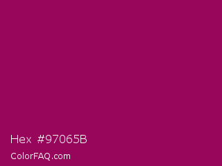 Hex #97065b Color is a normal magenta color and the nearest color is Cardinal Pink #8c055e. Hex code #97065b and RGB value is rgb(151,6,91). In RGB color space, this color is composed of 59% red, 2% green, 36% blue, In CMYK color space, this color is composed of 0% cyan, 96% magenta, 40% yellow , 41% black , In HSL color space, this color has a hue angle of 325° , 92% saturation and 31% lightness.