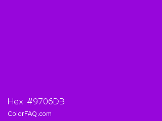 Hex #9706db Color is a normal purple color and the nearest color is Dark Violet #9400d3. Hex code #9706db and RGB value is rgb(151,6,219). In RGB color space, this color is composed of 59% red, 2% green, 86% blue, In CMYK color space, this color is composed of 31% cyan, 97% magenta, 0% yellow , 14% black , In HSL color space, this color has a hue angle of 281° , 95% saturation and 44% lightness.