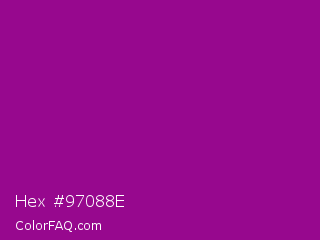 Hex #97088e Color is a normal magenta color and the nearest color is Violet Eggplant #991199. Hex code #97088e and RGB value is rgb(151,8,142). In RGB color space, this color is composed of 59% red, 3% green, 56% blue, In CMYK color space, this color is composed of 0% cyan, 95% magenta, 6% yellow , 41% black , In HSL color space, this color has a hue angle of 304° , 90% saturation and 31% lightness.
