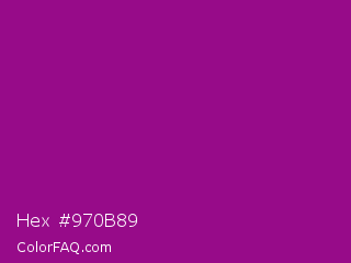 Hex #970b89 Color is a normal magenta color and the nearest color is Dark Magenta #8b008b. Hex code #970b89 and RGB value is rgb(151,11,137). In RGB color space, this color is composed of 59% red, 4% green, 54% blue, In CMYK color space, this color is composed of 0% cyan, 93% magenta, 9% yellow , 41% black , In HSL color space, this color has a hue angle of 306° , 86% saturation and 32% lightness.