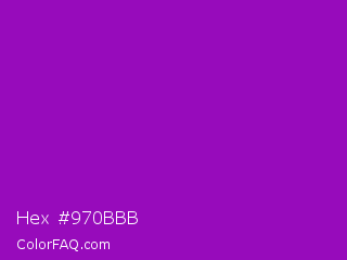 Hex #970bbb Color is a normal purple color and the nearest color is Purple Munsell #9f00c5. Hex code #970bbb and RGB value is rgb(151,11,187). In RGB color space, this color is composed of 59% red, 4% green, 73% blue, In CMYK color space, this color is composed of 19% cyan, 94% magenta, 0% yellow , 27% black , In HSL color space, this color has a hue angle of 288° , 89% saturation and 39% lightness.