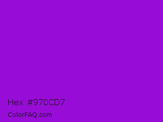 Hex #970cd7 Color is a normal purple color and the nearest color is Dark Violet #9400d3. Hex code #970cd7 and RGB value is rgb(151,12,215). In RGB color space, this color is composed of 59% red, 5% green, 84% blue, In CMYK color space, this color is composed of 30% cyan, 94% magenta, 0% yellow , 16% black , In HSL color space, this color has a hue angle of 281° , 89% saturation and 45% lightness.