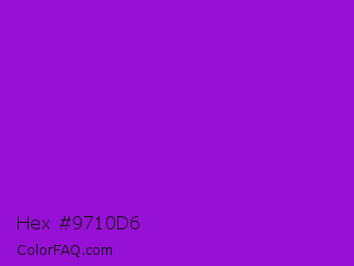 Hex #9710d6 Color is a normal purple color and the nearest color is Dark Violet #9400d3. Hex code #9710d6 and RGB value is rgb(151,16,214). In RGB color space, this color is composed of 59% red, 6% green, 84% blue, In CMYK color space, this color is composed of 29% cyan, 93% magenta, 0% yellow , 16% black , In HSL color space, this color has a hue angle of 281° , 86% saturation and 45% lightness.