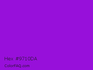 Hex #9710da Color is a normal purple color and the nearest color is Dark Violet #9400d3. Hex code #9710da and RGB value is rgb(151,16,218). In RGB color space, this color is composed of 59% red, 6% green, 85% blue, In CMYK color space, this color is composed of 31% cyan, 93% magenta, 0% yellow , 15% black , In HSL color space, this color has a hue angle of 280° , 86% saturation and 46% lightness.