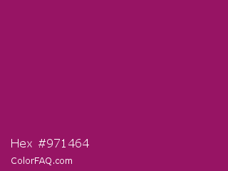 Hex #971464 Color is a normal magenta color and the nearest color is Jazzberry Jam #a50b5e. Hex code #971464 and RGB value is rgb(151,20,100). In RGB color space, this color is composed of 59% red, 8% green, 39% blue, In CMYK color space, this color is composed of 0% cyan, 87% magenta, 34% yellow , 41% black , In HSL color space, this color has a hue angle of 323° , 77% saturation and 34% lightness.