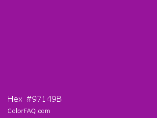 Hex #97149b Color is a normal magenta color and the nearest color is Violet Eggplant #991199. Hex code #97149b and RGB value is rgb(151,20,155). In RGB color space, this color is composed of 59% red, 8% green, 61% blue, In CMYK color space, this color is composed of 3% cyan, 87% magenta, 0% yellow , 39% black , In HSL color space, this color has a hue angle of 298° , 77% saturation and 34% lightness.