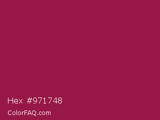 Hex #971748 Color is a normal rose color and the nearest color is Big Dip O Ruby #9c2542. Hex code #971748 and RGB value is rgb(151,23,72). In RGB color space, this color is composed of 59% red, 9% green, 28% blue, In CMYK color space, this color is composed of 0% cyan, 85% magenta, 52% yellow , 41% black , In HSL color space, this color has a hue angle of 337° , 74% saturation and 34% lightness.