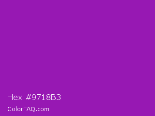 Hex #9718b3 Color is a normal purple color and the nearest color is Violet Eggplant #991199. Hex code #9718b3 and RGB value is rgb(151,24,179). In RGB color space, this color is composed of 59% red, 9% green, 70% blue, In CMYK color space, this color is composed of 16% cyan, 87% magenta, 0% yellow , 30% black , In HSL color space, this color has a hue angle of 289° , 76% saturation and 40% lightness.