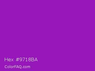 Hex #9718ba Color is a normal purple color and the nearest color is Purple Munsell #9f00c5. Hex code #9718ba and RGB value is rgb(151,24,186). In RGB color space, this color is composed of 59% red, 9% green, 73% blue, In CMYK color space, this color is composed of 19% cyan, 87% magenta, 0% yellow , 27% black , In HSL color space, this color has a hue angle of 287° , 77% saturation and 41% lightness.
