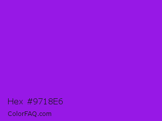Hex #9718e6 Color is a normal purple color and the nearest color is Veronica #a020f0. Hex code #9718e6 and RGB value is rgb(151,24,230). In RGB color space, this color is composed of 59% red, 9% green, 90% blue, In CMYK color space, this color is composed of 34% cyan, 90% magenta, 0% yellow , 10% black , In HSL color space, this color has a hue angle of 277° , 81% saturation and 50% lightness.