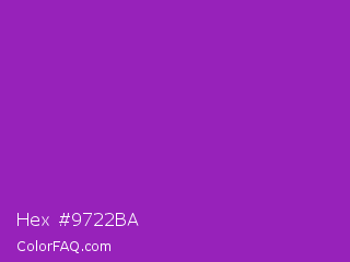 Hex #9722ba Color is a normal purple color and the nearest color is Dark Orchid #9932cc. Hex code #9722ba and RGB value is rgb(151,34,186). In RGB color space, this color is composed of 59% red, 13% green, 73% blue, In CMYK color space, this color is composed of 19% cyan, 82% magenta, 0% yellow , 27% black , In HSL color space, this color has a hue angle of 286° , 69% saturation and 43% lightness.
