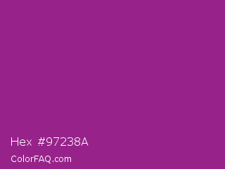Hex #97238a Color is a normal magenta color and the nearest color is Violet Eggplant #991199. Hex code #97238a and RGB value is rgb(151,35,138). In RGB color space, this color is composed of 59% red, 14% green, 54% blue, In CMYK color space, this color is composed of 0% cyan, 77% magenta, 9% yellow , 41% black , In HSL color space, this color has a hue angle of 307° , 62% saturation and 36% lightness.