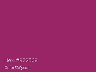 Hex #972568 Color is a normal magenta color and the nearest color is Amaranth Deep Purple #9f2b68. Hex code #972568 and RGB value is rgb(151,37,104). In RGB color space, this color is composed of 59% red, 15% green, 41% blue, In CMYK color space, this color is composed of 0% cyan, 75% magenta, 31% yellow , 41% black , In HSL color space, this color has a hue angle of 325° , 61% saturation and 37% lightness.