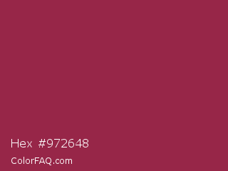 Hex #972648 Color is a normal rose color and the nearest color is Big Dip O Ruby #9c2542. Hex code #972648 and RGB value is rgb(151,38,72). In RGB color space, this color is composed of 59% red, 15% green, 28% blue, In CMYK color space, this color is composed of 0% cyan, 75% magenta, 52% yellow , 41% black , In HSL color space, this color has a hue angle of 342° , 60% saturation and 37% lightness.
