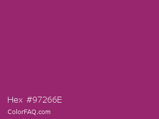 Hex #97266e Color is a normal magenta color and the nearest color is Amaranth Deep Purple #9f2b68. Hex code #97266e and RGB value is rgb(151,38,110). In RGB color space, this color is composed of 59% red, 15% green, 43% blue, In CMYK color space, this color is composed of 0% cyan, 75% magenta, 27% yellow , 41% black , In HSL color space, this color has a hue angle of 322° , 60% saturation and 37% lightness.
