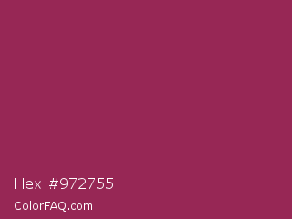 Hex #972755 Color is a normal rose color and the nearest color is Dark Raspberry #872657. Hex code #972755 and RGB value is rgb(151,39,85). In RGB color space, this color is composed of 59% red, 15% green, 33% blue, In CMYK color space, this color is composed of 0% cyan, 74% magenta, 44% yellow , 41% black , In HSL color space, this color has a hue angle of 335° , 59% saturation and 37% lightness.