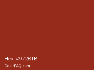 Hex #972b1b Color is a normal red color and the nearest color is Vivid Auburn #922724. Hex code #972b1b and RGB value is rgb(151,43,27). In RGB color space, this color is composed of 59% red, 17% green, 11% blue, In CMYK color space, this color is composed of 0% cyan, 72% magenta, 82% yellow , 41% black , In HSL color space, this color has a hue angle of 8° , 70% saturation and 35% lightness.