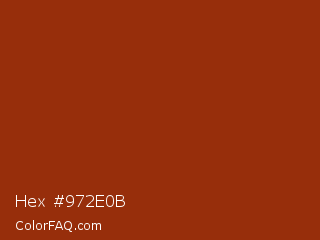Hex #972e0b Color is a normal color and the nearest color is Tabasco #a02712. Hex code #972e0b and RGB value is rgb(151,46,11). In RGB color space, this color is composed of 59% red, 18% green, 4% blue, In CMYK color space, this color is composed of 0% cyan, 70% magenta, 93% yellow , 41% black , In HSL color space, this color has a hue angle of 15° , 86% saturation and 32% lightness.