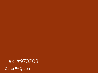 Hex #973208 Color is a normal orange color and the nearest color is Tabasco #a02712. Hex code #973208 and RGB value is rgb(151,50,8). In RGB color space, this color is composed of 59% red, 20% green, 3% blue, In CMYK color space, this color is composed of 0% cyan, 67% magenta, 95% yellow , 41% black , In HSL color space, this color has a hue angle of 18° , 90% saturation and 31% lightness.