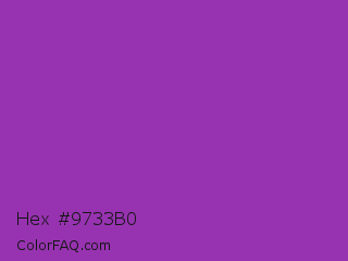Hex #9733b0 Color is a normal purple color and the nearest color is Purpureus #9a4eae. Hex code #9733b0 and RGB value is rgb(151,51,176). In RGB color space, this color is composed of 59% red, 20% green, 69% blue, In CMYK color space, this color is composed of 14% cyan, 71% magenta, 0% yellow , 31% black , In HSL color space, this color has a hue angle of 288° , 55% saturation and 45% lightness.