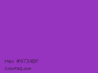 Hex #9734bf Color is a normal purple color and the nearest color is Dark Orchid #9932cc. Hex code #9734bf and RGB value is rgb(151,52,191). In RGB color space, this color is composed of 59% red, 20% green, 75% blue, In CMYK color space, this color is composed of 21% cyan, 73% magenta, 0% yellow , 25% black , In HSL color space, this color has a hue angle of 283° , 57% saturation and 48% lightness.