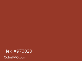 Hex #973828 Color is a normal red color and the nearest color is Prairie Sand #9a3820. Hex code #973828 and RGB value is rgb(151,56,40). In RGB color space, this color is composed of 59% red, 22% green, 16% blue, In CMYK color space, this color is composed of 0% cyan, 63% magenta, 74% yellow , 41% black , In HSL color space, this color has a hue angle of 9° , 58% saturation and 37% lightness.