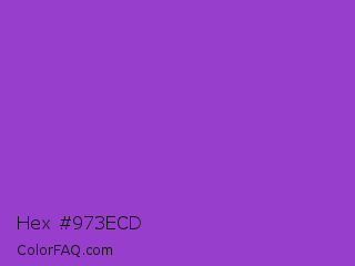 Hex #973ecd Color is a normal purple color and the nearest color is Dark Orchid #9932cc. Hex code #973ecd and RGB value is rgb(151,62,205). In RGB color space, this color is composed of 59% red, 24% green, 80% blue, In CMYK color space, this color is composed of 26% cyan, 70% magenta, 0% yellow , 20% black , In HSL color space, this color has a hue angle of 277° , 59% saturation and 52% lightness.