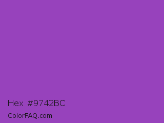 Hex #9742bc Color is a normal purple color and the nearest color is Purple Plum #9c51b6. Hex code #9742bc and RGB value is rgb(151,66,188). In RGB color space, this color is composed of 59% red, 26% green, 74% blue, In CMYK color space, this color is composed of 20% cyan, 65% magenta, 0% yellow , 26% black , In HSL color space, this color has a hue angle of 282° , 48% saturation and 50% lightness.