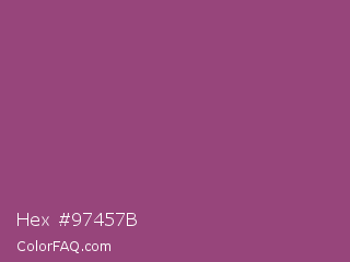 Hex #97457b Color is a normal magenta color and the nearest color is Magenta Haze #9f4576. Hex code #97457b and RGB value is rgb(151,69,123). In RGB color space, this color is composed of 59% red, 27% green, 48% blue, In CMYK color space, this color is composed of 0% cyan, 54% magenta, 19% yellow , 41% black , In HSL color space, this color has a hue angle of 320° , 37% saturation and 43% lightness.