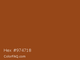 Hex #974718 Color is a normal orange color and the nearest color is Cumin #924321. Hex code #974718 and RGB value is rgb(151,71,24). In RGB color space, this color is composed of 59% red, 28% green, 9% blue, In CMYK color space, this color is composed of 0% cyan, 53% magenta, 84% yellow , 41% black , In HSL color space, this color has a hue angle of 22° , 73% saturation and 34% lightness.