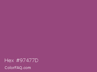 Hex #97477d Color is a normal magenta color and the nearest color is Magenta Haze #9f4576. Hex code #97477d and RGB value is rgb(151,71,125). In RGB color space, this color is composed of 59% red, 28% green, 49% blue, In CMYK color space, this color is composed of 0% cyan, 53% magenta, 17% yellow , 41% black , In HSL color space, this color has a hue angle of 320° , 36% saturation and 44% lightness.