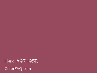 Hex #97495d Color is a normal red color and the nearest color is Vin Rouge #983d61. Hex code #97495d and RGB value is rgb(151,73,93). In RGB color space, this color is composed of 59% red, 29% green, 36% blue, In CMYK color space, this color is composed of 0% cyan, 52% magenta, 38% yellow , 41% black , In HSL color space, this color has a hue angle of 345° , 35% saturation and 44% lightness.