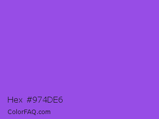 Hex #974de6 Color is a normal violet color and the nearest color is Navy Purple #9457eb. Hex code #974de6 and RGB value is rgb(151,77,230). In RGB color space, this color is composed of 59% red, 30% green, 90% blue, In CMYK color space, this color is composed of 34% cyan, 67% magenta, 0% yellow , 10% black , In HSL color space, this color has a hue angle of 269° , 75% saturation and 60% lightness.