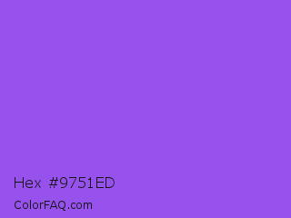 Hex #9751ed Color is a light violet color and the nearest color is Navy Purple #9457eb. Hex code #9751ed and RGB value is rgb(151,81,237). In RGB color space, this color is composed of 59% red, 32% green, 93% blue, In CMYK color space, this color is composed of 36% cyan, 66% magenta, 0% yellow , 7% black , In HSL color space, this color has a hue angle of 267° , 81% saturation and 62% lightness.
