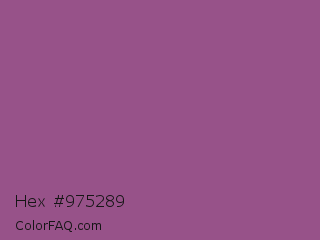 Hex #975289 Color is a normal magenta color and the nearest color is Razzmic Berry #8d4e85. Hex code #975289 and RGB value is rgb(151,82,137). In RGB color space, this color is composed of 59% red, 32% green, 54% blue, In CMYK color space, this color is composed of 0% cyan, 46% magenta, 9% yellow , 41% black , In HSL color space, this color has a hue angle of 312° , 30% saturation and 46% lightness.