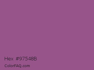 Hex #97548b Color is a normal magenta color and the nearest color is Antique Fuchsia #915c83. Hex code #97548b and RGB value is rgb(151,84,139). In RGB color space, this color is composed of 59% red, 33% green, 55% blue, In CMYK color space, this color is composed of 0% cyan, 44% magenta, 8% yellow , 41% black , In HSL color space, this color has a hue angle of 311° , 29% saturation and 46% lightness.