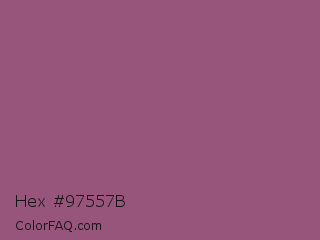 Hex #97557b Color is a normal magenta color and the nearest color is Sugar Plum #914e75. Hex code #97557b and RGB value is rgb(151,85,123). In RGB color space, this color is composed of 59% red, 33% green, 48% blue, In CMYK color space, this color is composed of 0% cyan, 44% magenta, 19% yellow , 41% black , In HSL color space, this color has a hue angle of 325° , 28% saturation and 46% lightness.