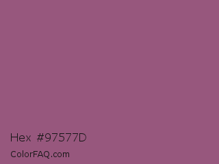 Hex #97577d Color is a normal magenta color and the nearest color is Antique Fuchsia #915c83. Hex code #97577d and RGB value is rgb(151,87,125). In RGB color space, this color is composed of 59% red, 34% green, 49% blue, In CMYK color space, this color is composed of 0% cyan, 42% magenta, 17% yellow , 41% black , In HSL color space, this color has a hue angle of 324° , 27% saturation and 47% lightness.