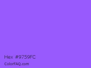 Hex #9759fc Color is a light violet color and the nearest color is Navy Purple #9457eb. Hex code #9759fc and RGB value is rgb(151,89,252). In RGB color space, this color is composed of 59% red, 35% green, 99% blue, In CMYK color space, this color is composed of 40% cyan, 65% magenta, 0% yellow , 1% black , In HSL color space, this color has a hue angle of 263° , 96% saturation and 67% lightness.
